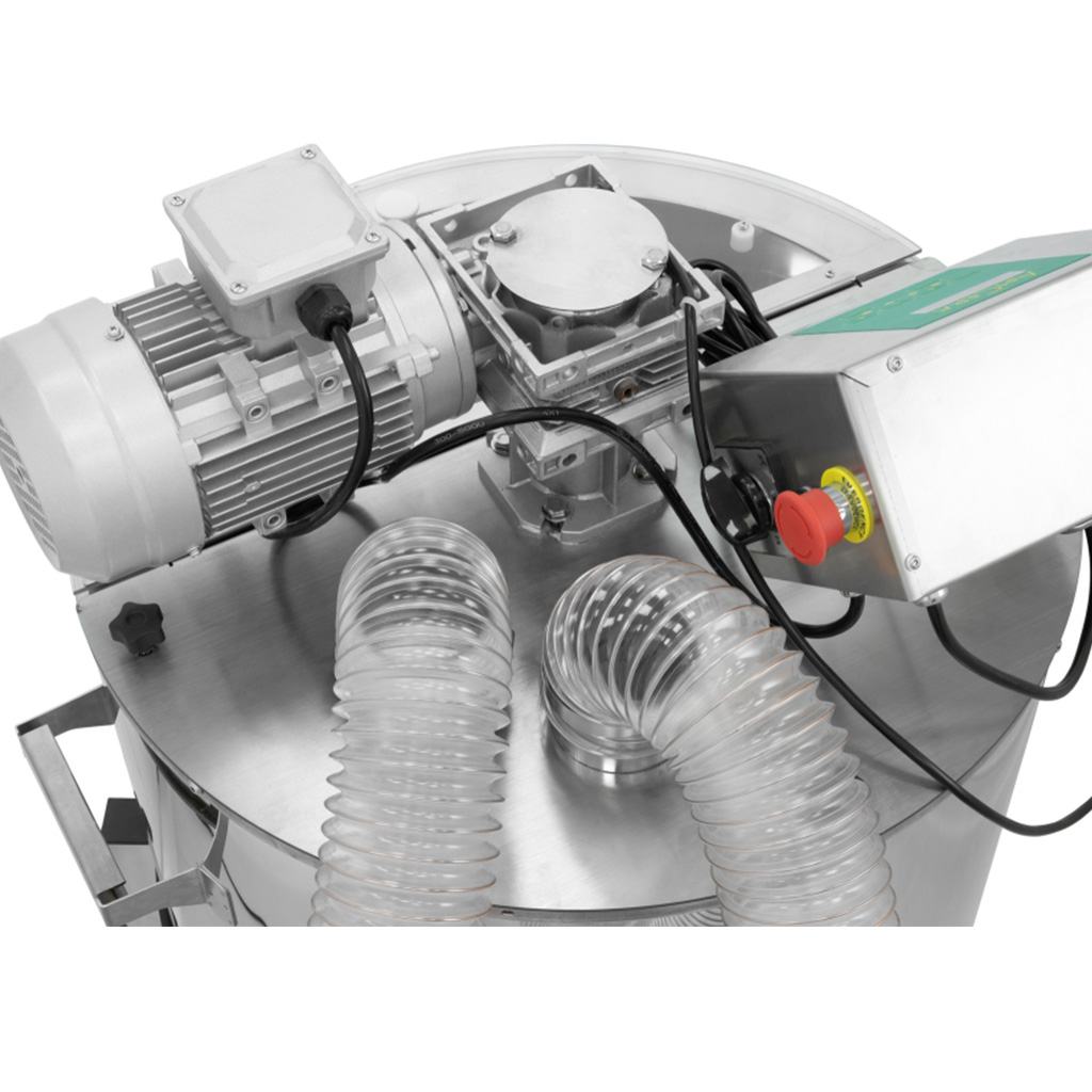 Nádoba, robustná miešacia špirála aj nohy sú vyrobené z potravinárskej nerezovej ocele - pre vysokú hygienu, jednoduché čistenie a dlhú životnosť aj pri pravidelnom používaní. Kónické dno s výpustou v úrovni dna nádoby umožňuje pohodlné a takmer bezo zvyškové vypustenie medu bez nakláňania. Odnímateľný rúrkový nožový ventil (1 ½") zjednodušuje obsluhu aj údržbu. Priehľadné bezpečnostné vrchnák poskytuje kontrolu nad procesom a prispieva k bezpečnej prevádzke. Stabilitu zaisťujú tri pevné nohy, komfort pri manipulácii potom ergonomické držadlá, ktoré zostávajú chladné aj pri ohreve.