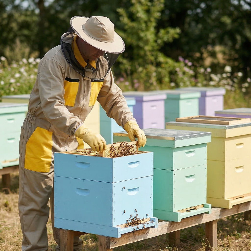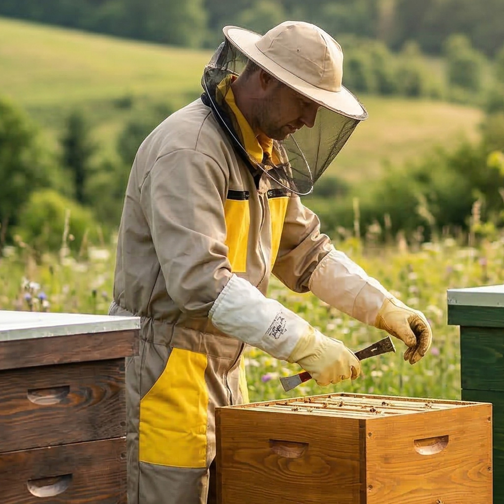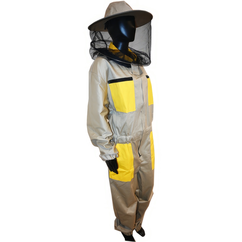 Komplexná farebná včelárska kombinéza s klobúkom (dostupná vo veľkostiach S až XXXL) je ideálnym riešením pre každého včelára, ktorý hľadá spoľahlivú ochranu celej postavy. Práca so včelami vyžaduje pokoj a sústredenie, čo vám tento odev plne dopraje. Včelárska kombinéza je vyrobená z kvalitných a pevných materiálov, ktoré efektívne bránia včelím bodnutiam, takže sa nebudete musieť báť ani tých najbodavejších včiel. Kombinéza navyše skvele padne takmer každému a jej hnedo-žlté prevedenie vyzerá naozaj elegantne a profesionálne.