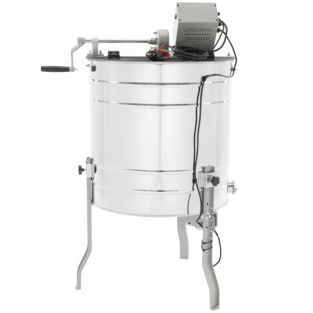 Model je navrhnutý tak, aby šetril čas aj sily pri práci na včelnici. Veľkým benefitom je kombinovaný pohon (ručný elektrický) – medomet je možné napájať ako z 230 V v medárni, tak z 12 V napríklad z autobatérie na kočovnom stanovisku. Keď dôjde k výpadku prúdu, plynule nadviažete ručnou kľukou s brzdou . Elektrický pohon s ovládaním cez digitálny potenciometer (CDD) umožňuje plynulú reguláciu otáčok, takže počas vytáčania môžete v pokoji odviečkovávať ďalšie rámiky.