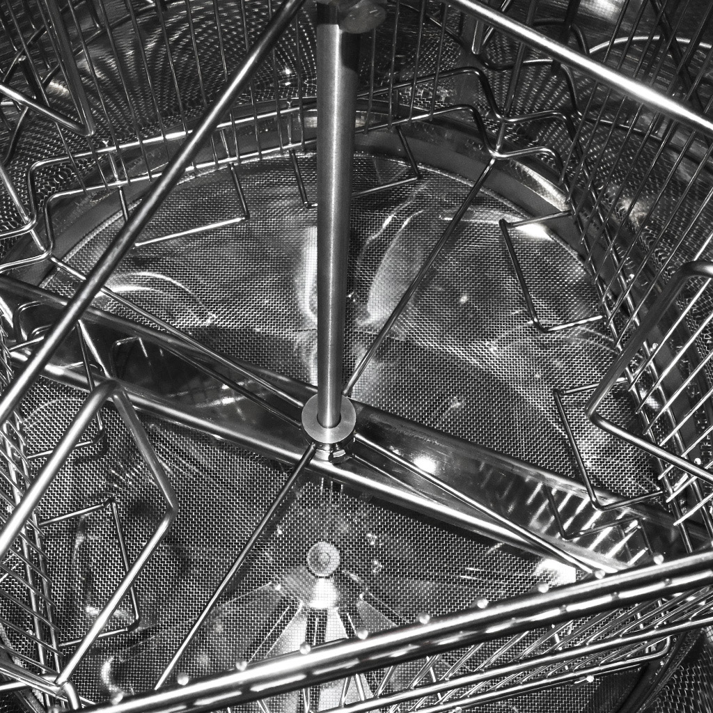Systém pohonu je vždy umiestnený v hornej časti medometu, čo poskytuje možnosť jednoduchej údržby. Vďaka tomuto riešeniu je kôš medometu v spodnej časti voľne umiestnený na guličkovom ložisku. Pohon je umiestnený na upínacej lište, na ktorej sú zároveň široké pánty na kryty z plexiskla. Upínacia lišta s pohonom je dostatočne masívna, opäť z lešteného nerezového materiálu, pre ľahkú údržbu. Po sňatí hornej lišty s pohonom, ktorá je pripevnená dvoma hviezdicovými skrutkami, je možné celý pohon jednoducho zložiť. Rovnako jednoducho vyberiete celý kôš z medometu a môžete ľahko celý medomet aj kôš zvlášť vyčistiť.