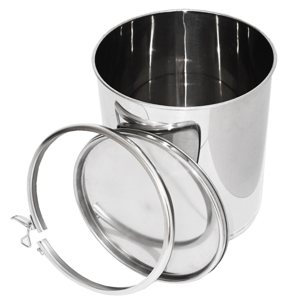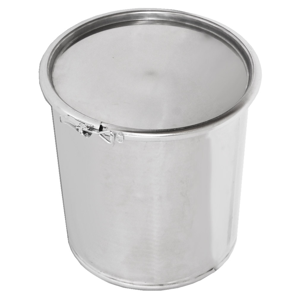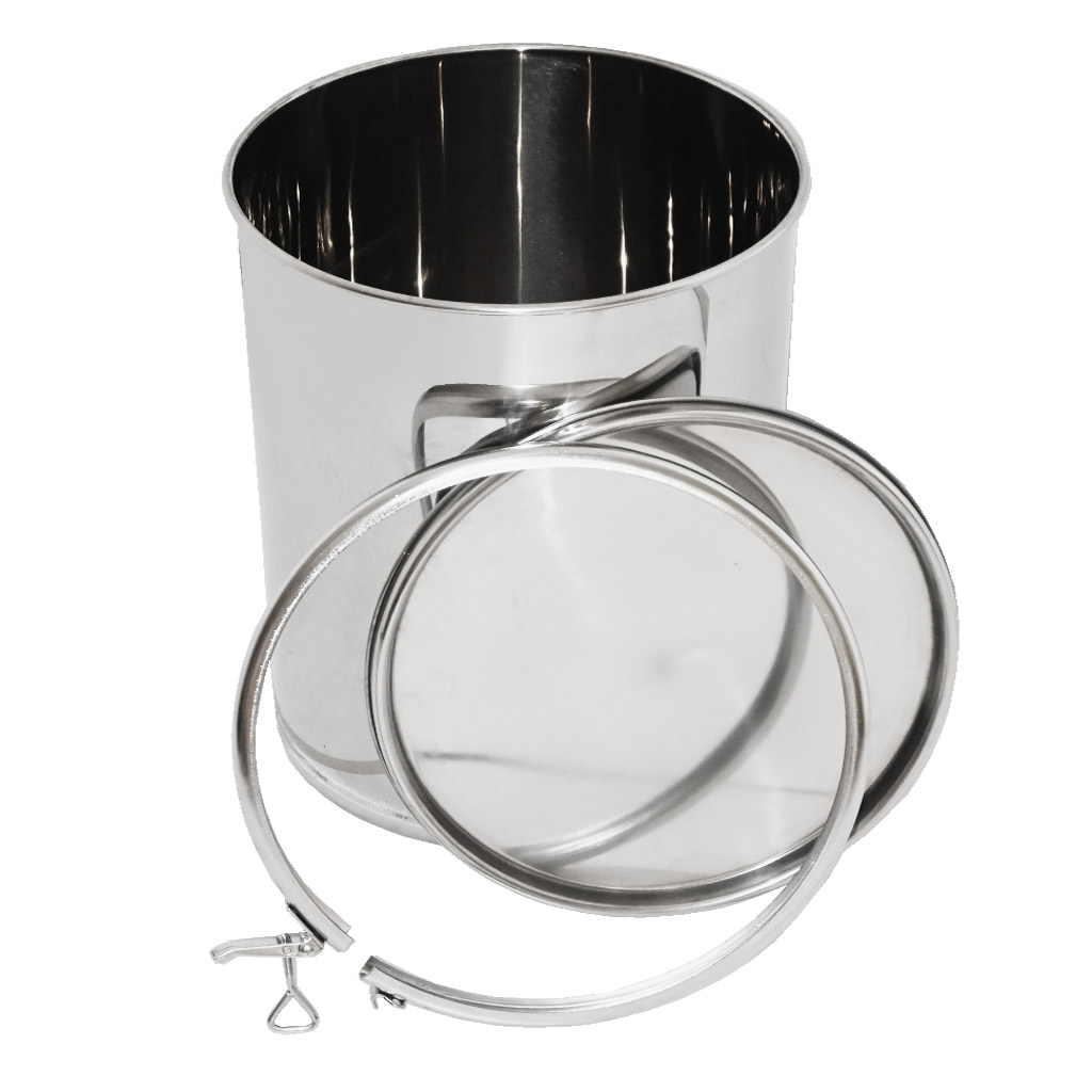 Kvalitná nerezová nádoba na uskladnenie medu. Vybavená tesniacim vrchákom a háčikmi pre pevné stiahnutie veka s nádobou. V prázdnom stave sú nádoby stohovateľné. Sú vyrábané z kvalitnej nerezovej ocele, určené na potravinárske účely s dostatočnej hrúbkou (0,8 až 1 mm), tak aby nemohlo jednoducho dochádzať k nechceným zárezom. Všetky časti nádob sú kvalitne zvarené pomocou plazmového zvárania. Pri konštrukcii je kladený dôraz na hladké povrchy, ktoré je možné ľahko čistiť, preto sú nádoby vyrobené z leštených nerezových plechov. Všetky naše nádoby sú opatrené nerezovými madlami pre ľahké prenášanie. Rozmery: výška 30 cm, priemer 30,5 cm. .