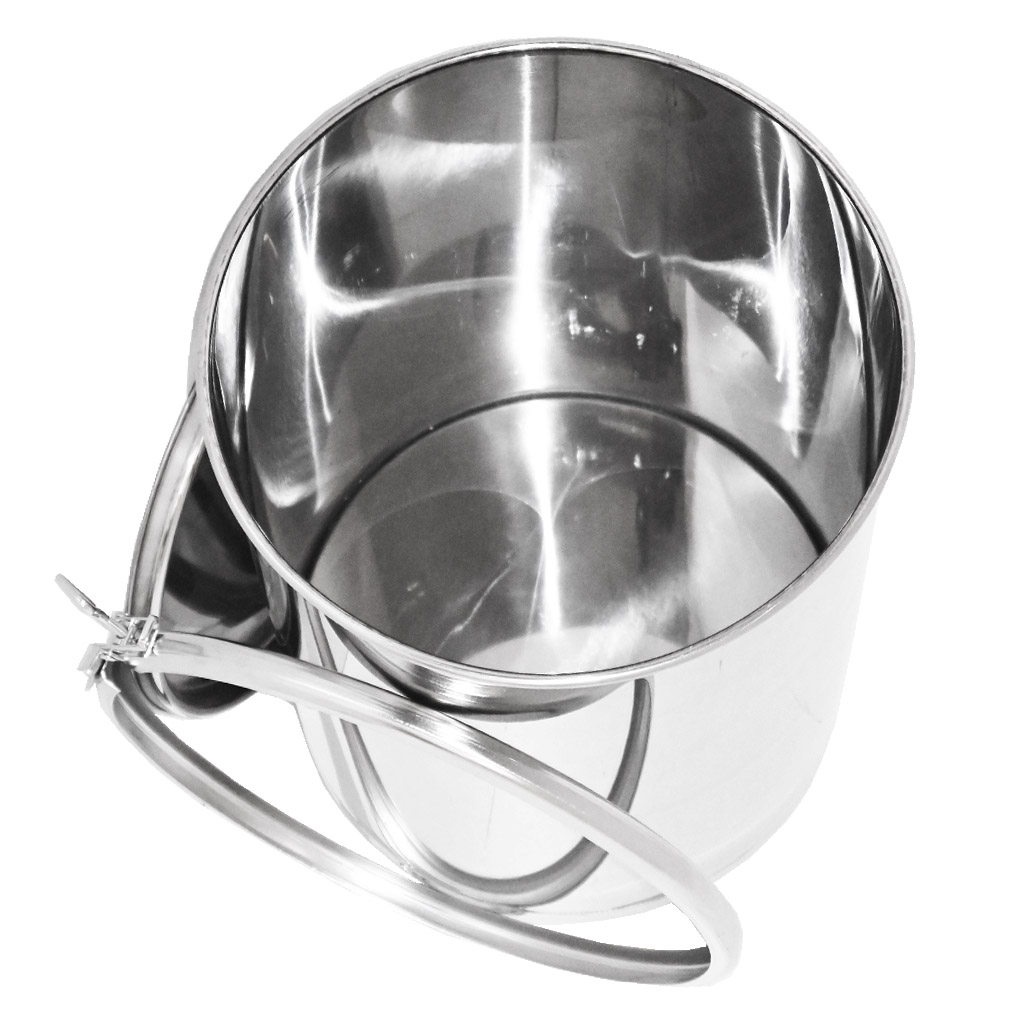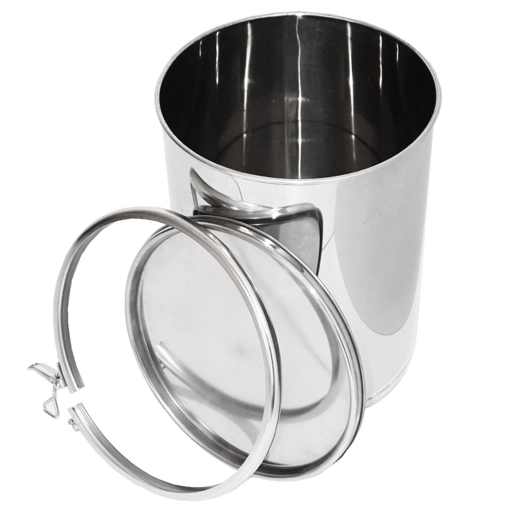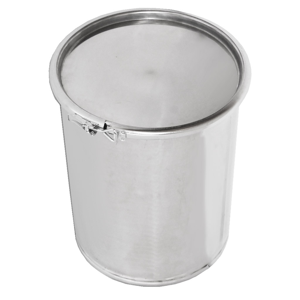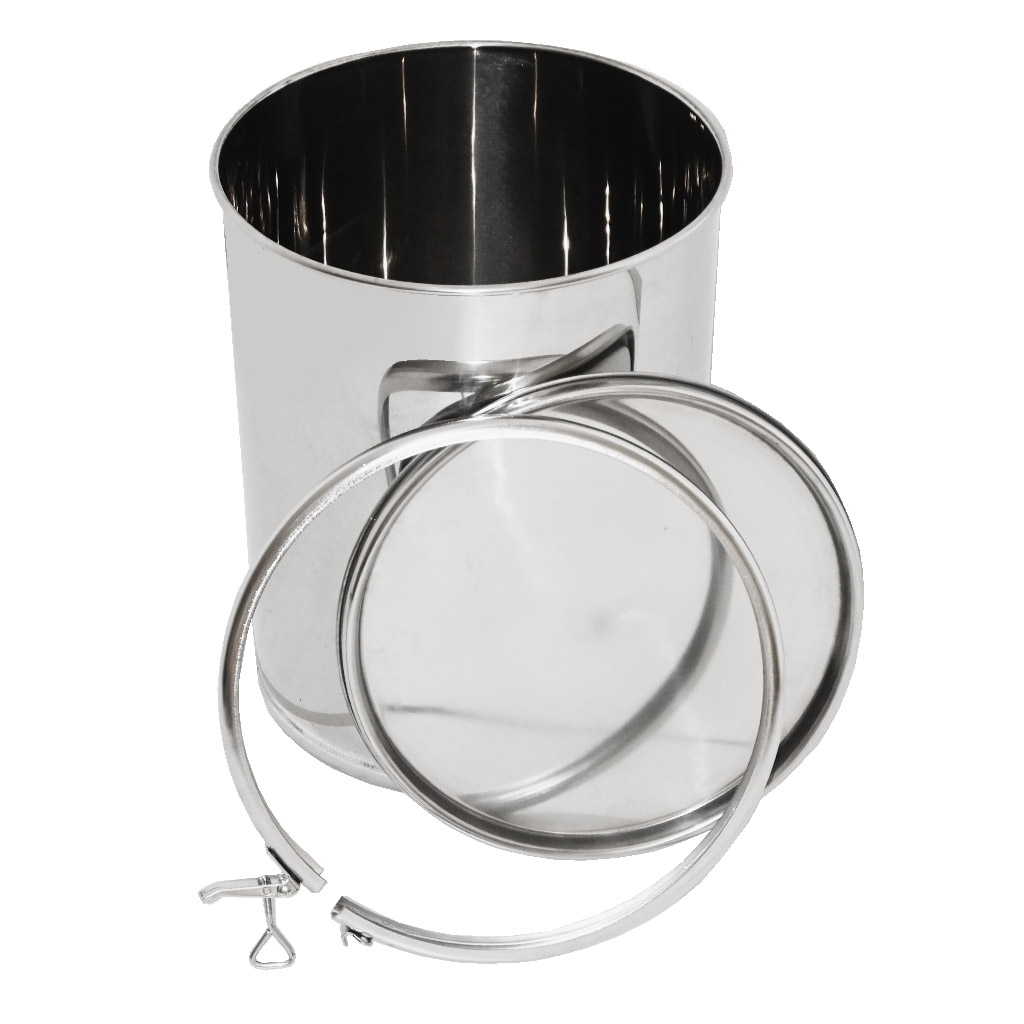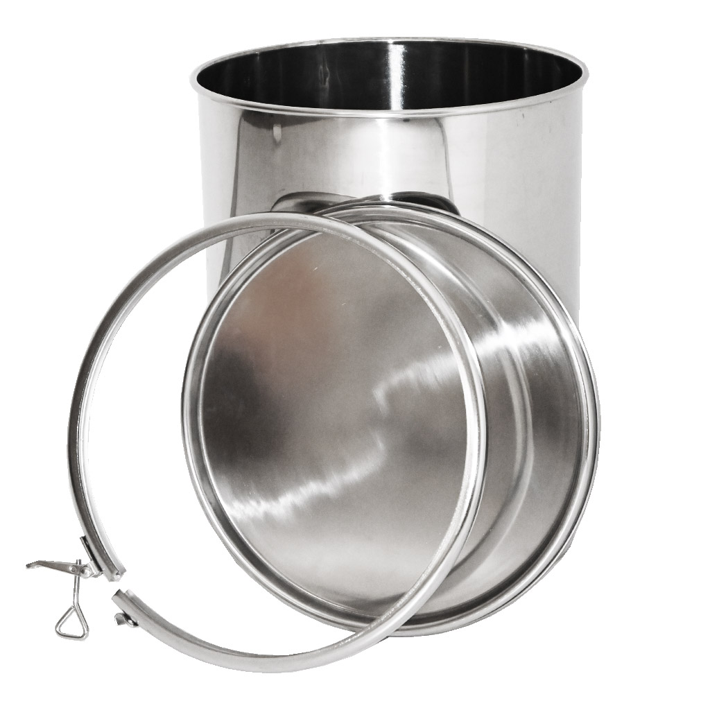 Kvalitná nerezová nádoba na uskladnenie medu. Vybavená tesniacim vrchákom a háčikmi pre pevné stiahnutie veka s nádobou. V prázdnom stave sú nádoby stohovateľné. Sú vyrábané z kvalitnej nerezovej ocele, určené na potravinárske účely s dostatočnej hrúbkou (0,8 až 1 mm), tak aby nemohlo jednoducho dochádzať k nechceným zárezom. Všetky časti nádob sú kvalitne zvarené pomocou plazmového zvárania. Pri konštrukcii je kladený dôraz na hladké povrchy, ktoré je možné ľahko čistiť, preto sú nádoby vyrobené z leštených nerezových plechov. Všetky naše nádoby sú opatrené nerezovými madlami pre ľahké prenášanie. Rozmery: výška 39 cm, priemer 30,5 cm. .