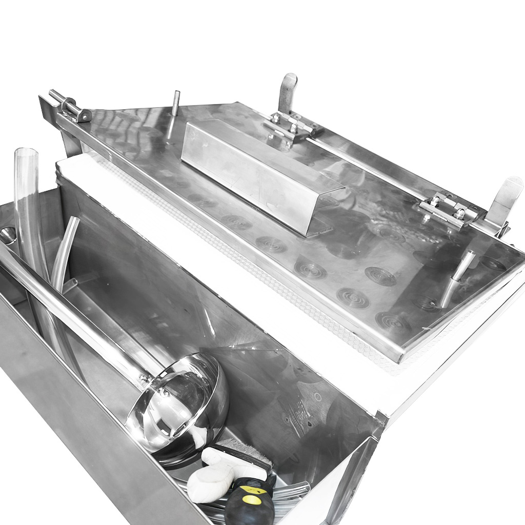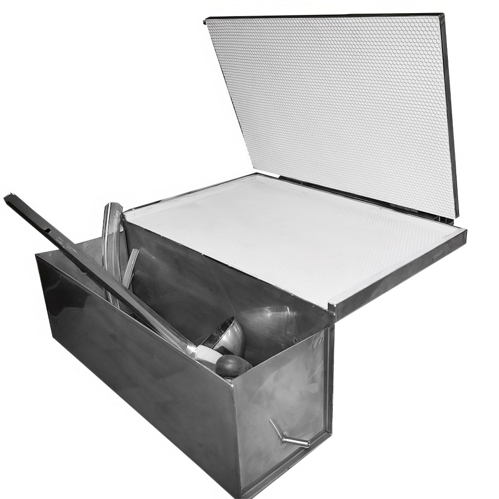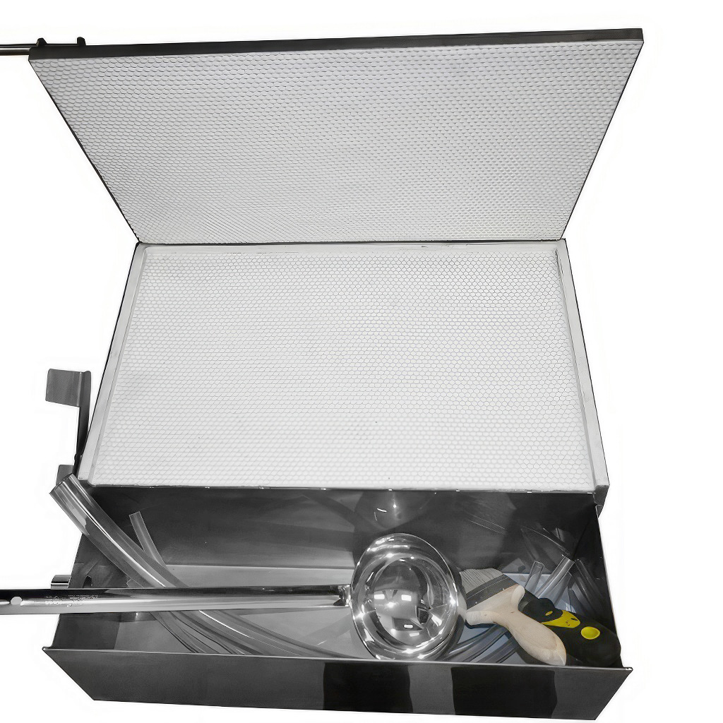 Ručný lis na medzistienky s vodným chladením a silikónovou matricou je praktická pomôcka pre včelárov, ktorí chcú spracovávať vlastný vosk a mať výrobu medzistienok plne pod kontrolou. Chladenie je riešené v hornej časti formy s priamym napojením na vodu, vďaka čomu medzistienka rýchlejšie tuhne, lisovanie lepšie nadväzuje a práca má svižné tempo. Prebytky vosku stekajú do integrovaného kaslíka, takže cenný materiál nekončí na stole a okolie zostáva čisté. Rozmer formy 420 × 205 mm vyhovuje väčšine bežne používaných rámikových mier. Lis je dodávaný ako sada pripravená na použitie vrátane nerezovej špachtle, naberačky, štetca a hadíc na chladenie.