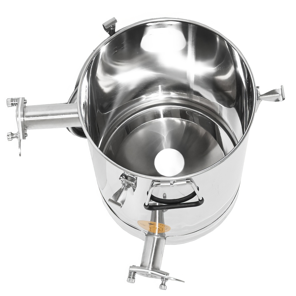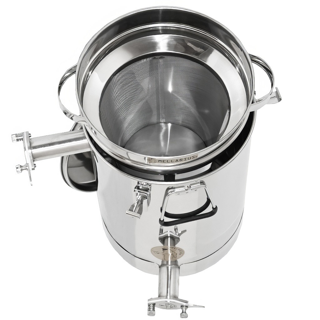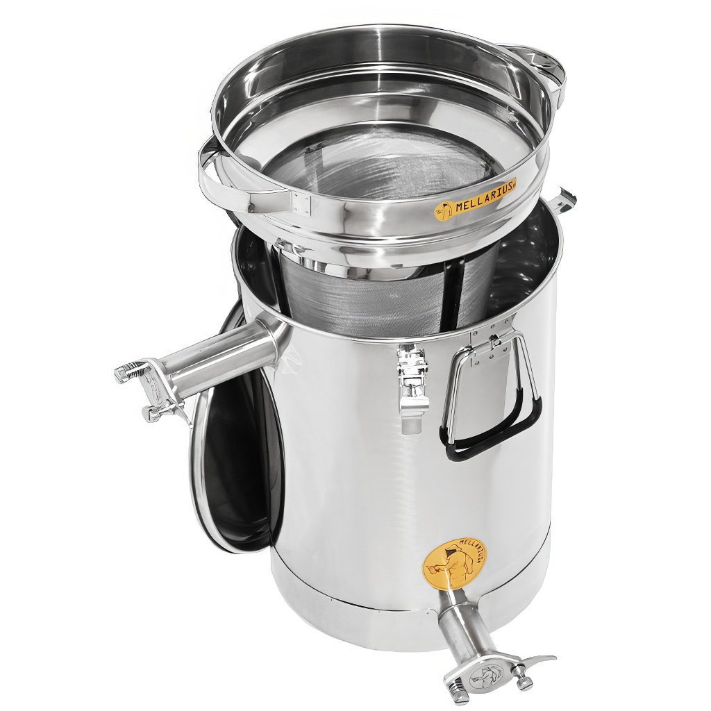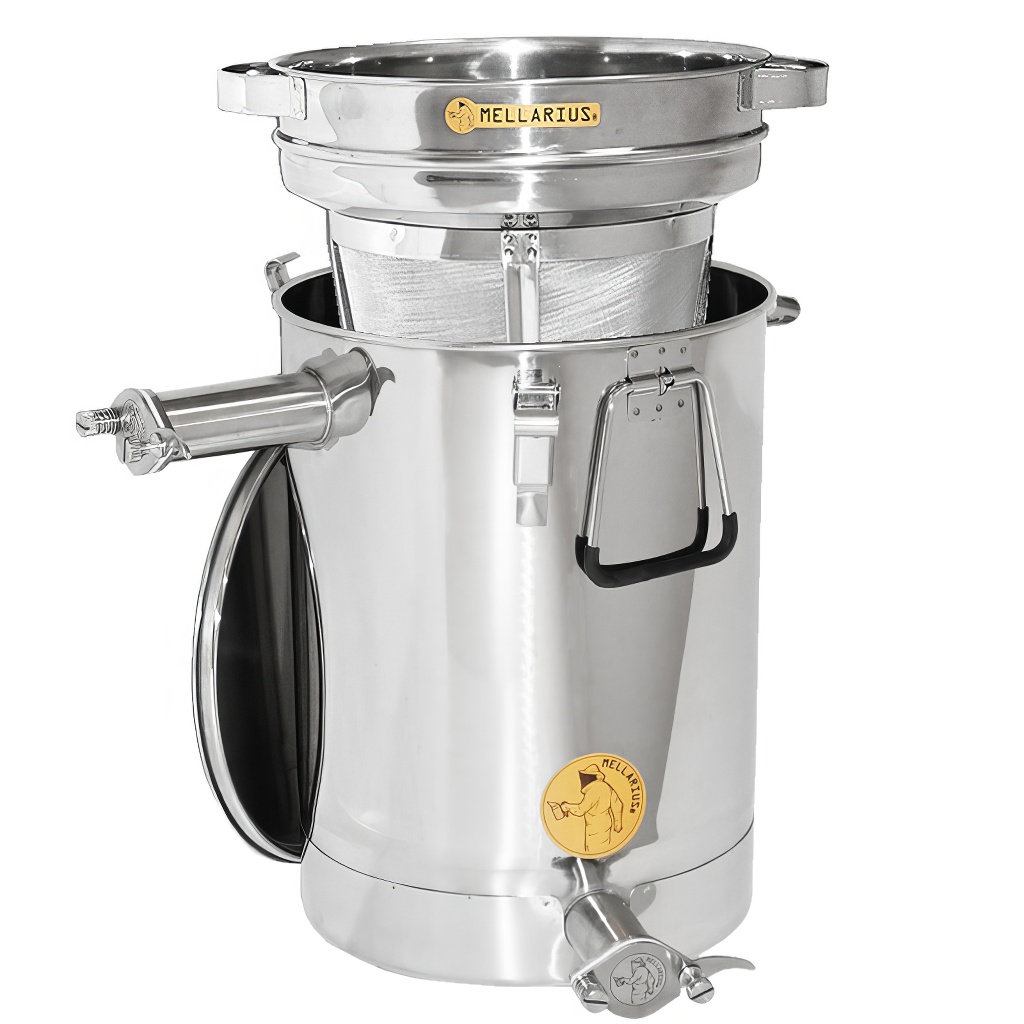 Nádoby na med Mellarius v niekoľkých variantoch, v tomto prípade s vyspádovaným dnom, tesniacim vrchákom a dvoma navarenými nerezovými kohútikmi, ktoré dovoľujú nádobu používať ako čeriacu nádobu na med. Sú vyrábané z kvalitnej nerezovej ocele, určené na potravinárske účely s dostatočnej hrúbkou (0,8 až 1 mm), tak aby nemohlo jednoducho dochádzať k nechceným zárezom. Všetky časti nádob sú kvalitne zvarené pomocou plazmového zvárania. Pri konštrukcii je kladený dôraz na hladké povrchy, ktoré je možné ľahko čistiť, preto sú nádoby vyrobené z leštených nerezových plechov. Všetky naše nádoby sú opatrené nerezovými madlami pre ľahké prenášanie. Súčasťou balenia je aj nerezové sito, ktoré môžete vložiť do nádoby a pomocou horného kohútika ju využívať ako čeriacu nádobu.