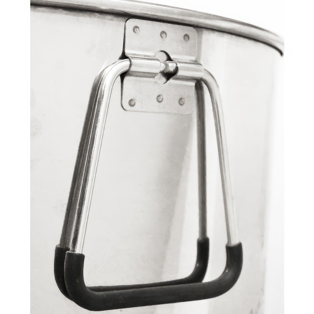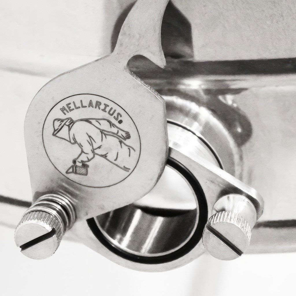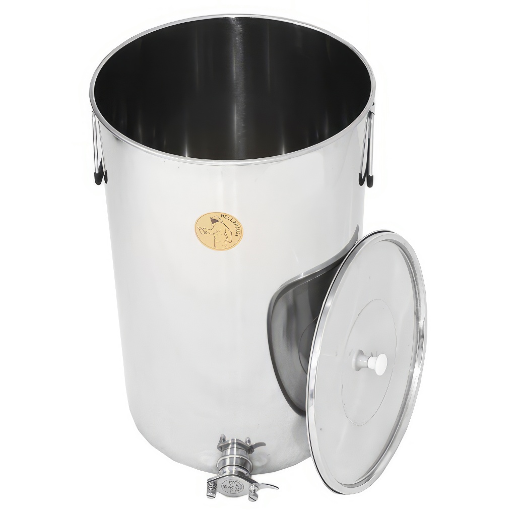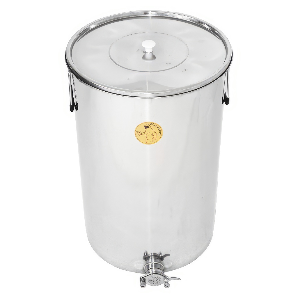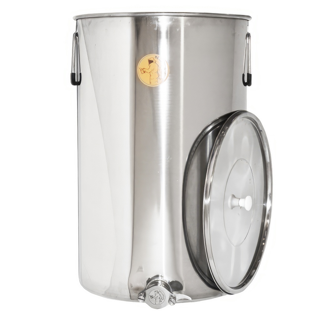 Stáčacia nemecká nerezová nádoba Mellarius na 100 kg medu s nerezovým kohútom a nerezovým vrchákom, ktoré má nové skoby pre pevné uchytenie veka s nádobou pre ľahšiu manipuláciu.