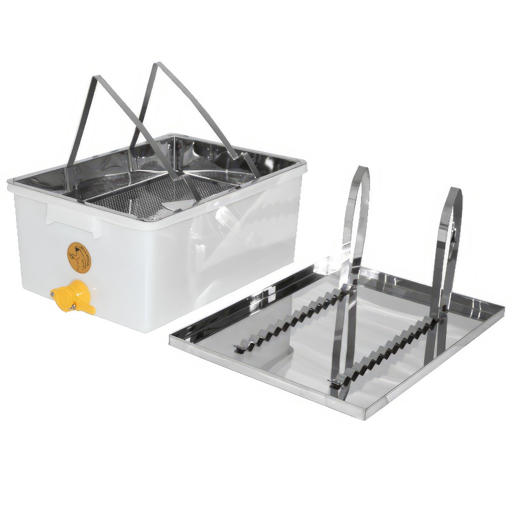 Vyššia vanička má v praxi jasnú výhodu: pojme dostatok viečok aj stekajúceho medu a pomáha zabrániť pretekaniu počas práce. Použitie je jednoduché - do dierovanej nerezovej vložky nasadíte pribalené nohy, rámik stabilne oprite a môžete plynulo odviečkovať.