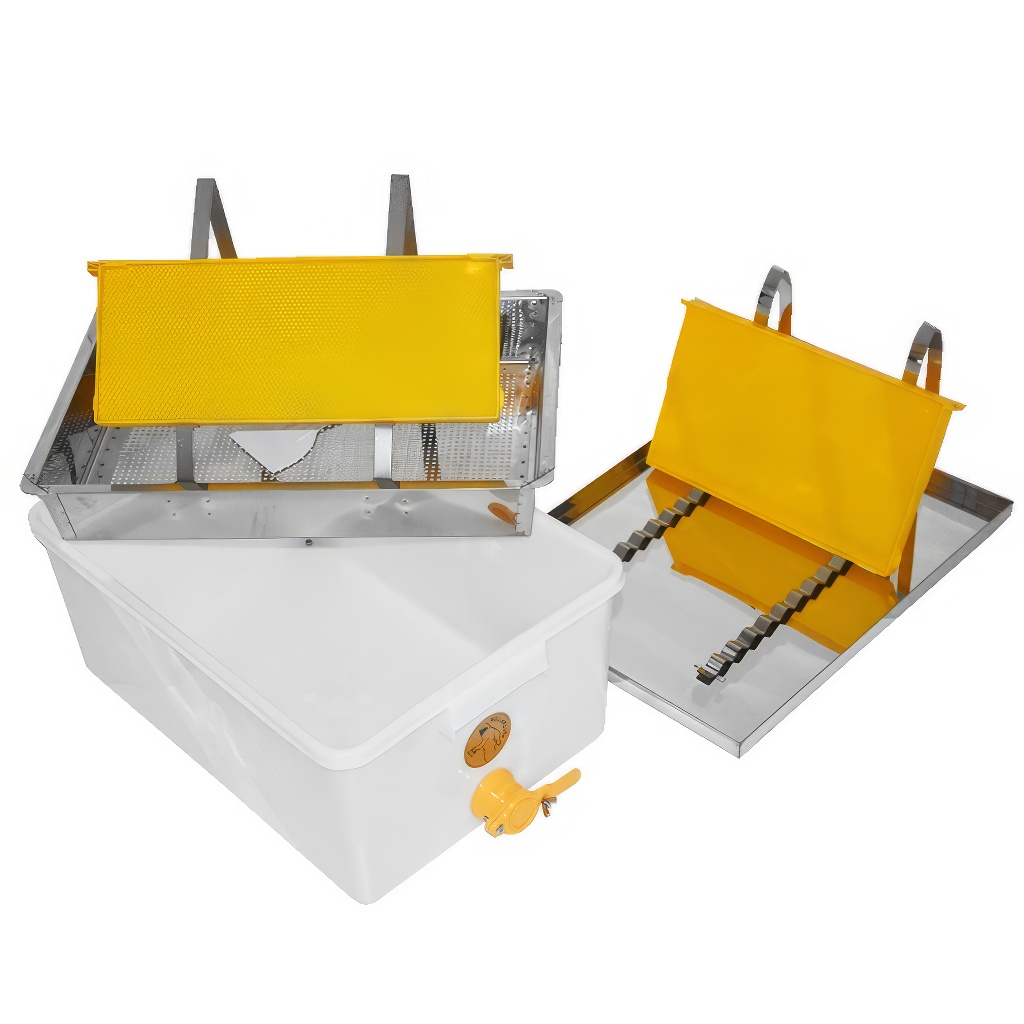 Súčasťou zostavy je tiež nerezový odkladací podnos na rámiky . Odviečkované plásty ľahko odkladáte do držiaka, ktorý položíte na tácku – med tak nekvapká na podlahu a pracovisko zostáva čisté aj pri intenzívnom medobraní.
