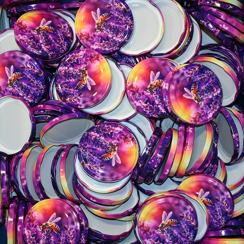 Skrutkovacie viečko vzor Včela a levanduľa - HO17 na poháre Včela 730 ml, Facette 720 ml, Fass 720 ml, Facette 580 ml a Facette 420 ml. Graficky veľmi pekne spracované viečko pre štandardné poháre, ktoré sa používajú na stočený med. S týmto viečkom svojmu medu určite hanbu neurobíte. Celé balenie obsahuje 700 kusov.